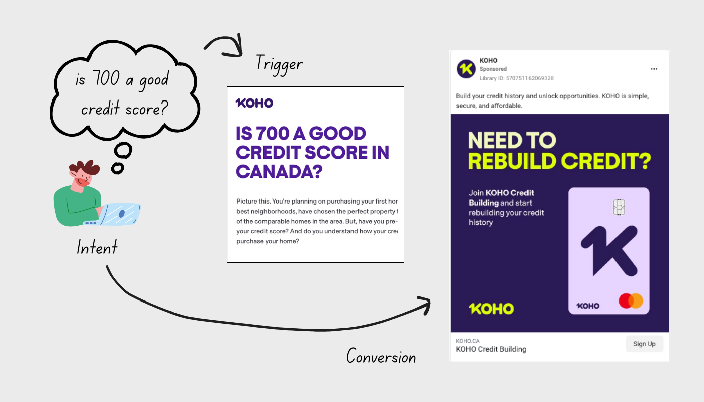 During my time at KOHO, we developed a strategy to attract a wide audience at the top of the funnel. So when you think of credit scores, you think KOHO. Consumers didn’t know KOHO existed just yet; to vie for their attention effectively, we needed to be in front of the users with the right context.